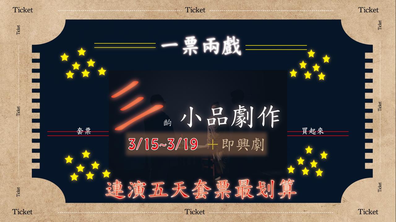 各位愛SHOW的粉絲們,新年快樂唷! 祝福大家「虎」哩爽一年啦! 下面三張海報的戲,將會在三月中旬(3/15~3/19)演出, 在新年的時候特別預告,希望大家空下時間揪親友一起來看戲! 這次三齣戲剛好每齣戲是1,2,3人的演出~哇!有獨角戲、對手戲、還有三人的讀劇演出呢! 想看戲的你們,快到<<訂票請走>>頁面,手刀購票!! 偷偷告訴你們~~買套票比較划算喔! 一起看戲看個過癮吧!