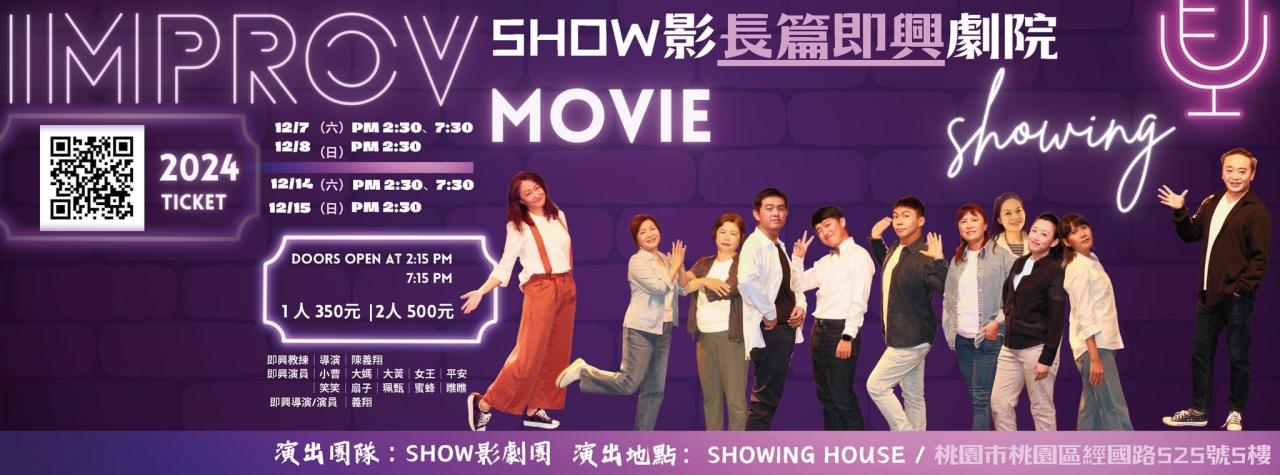 長篇即興劇:就是沒有劇本的演出形式,由觀眾提出建議成為演員的靈感,立即在舞台上出現一幕幕如同電影般的鏡頭切換,完成一齣如同有劇本的戲劇表演,因為是即興,只能概估時間約為60分鐘或更長。 這次就由觀眾來提出想看的、全球還沒上映的電影名稱,挑戰即興劇演員在觀眾面前上映演出! PS.即興劇演出因觀眾提出的建議下演出,無法確定每一場的演出分級制度,建議12歲以上民眾觀賞,未成年者應有家人陪同。