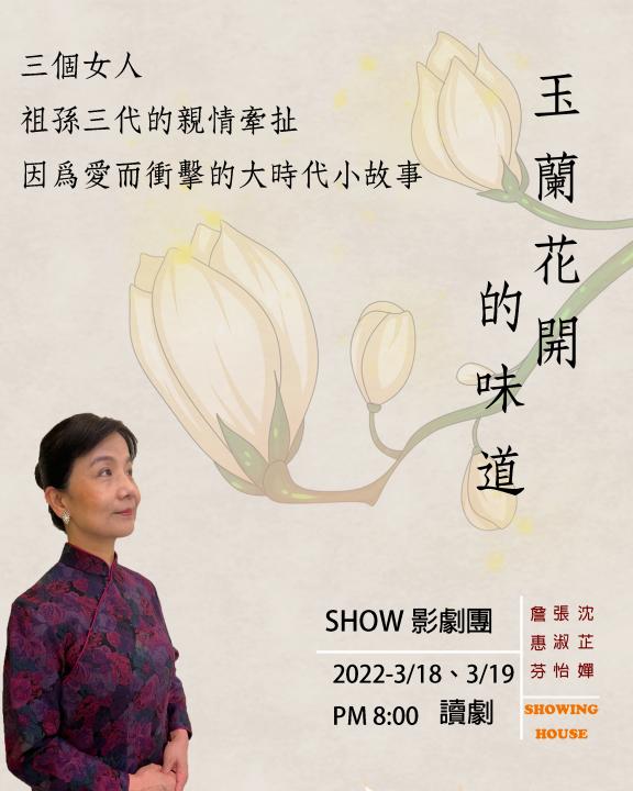 玉蘭花開的味道演員: 詹惠芬 張淑怡 沈芷嬋 2022/3/18、3/19 故事圍繞著三個女人祖孫三代的親情牽扯,因爲愛而衝擊的大時代小故事