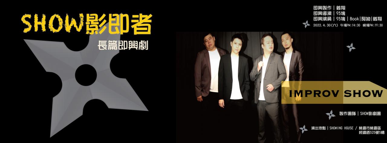 長篇即興劇:就是沒有劇本的演出形式,由觀眾提出建議成為演員的靈感,立即在舞台上出現一幕幕如同電影般的鏡頭切換,完成一齣如同有劇本的戲劇表演,因為是即興,只能概估時間約為60分鐘或更長。 這次就由觀眾來提出想看的、全球還沒上映的電影名稱,挑戰即興劇演員在觀眾面前上映演出! PS.即興劇演出因觀眾提出的建議下演出,無法確定每一場的演出分級制度,建議12歲以上民眾觀賞,未成年者應有家人陪同。