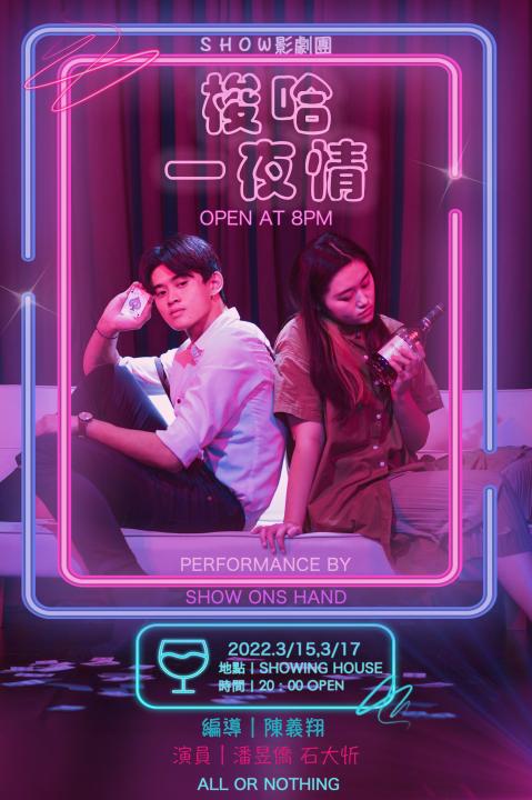 一夜情過後,你能記得多少?在偵訊室裡, 諜對諜的愛情對手戲, 將你所遺忘的愛, 全部都找回來! 30分鐘讓你愛上一個人! SHOW ONS HAND 編導|陳義翔 演員|潘昱僑|石大忻 2022.3/15、3/17 pm:8點 |